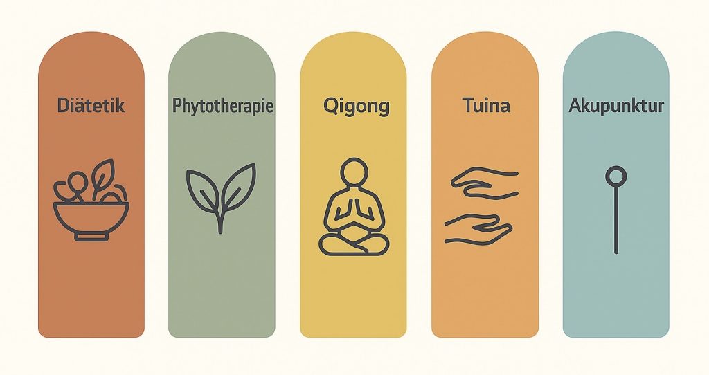 Die erste Säule der TCM ist die Diätetik. Durch aufgenommene Nahrungsmittel kann die körperliche Balance direkt beeinflusst werden. Dabei werden Lebensmittel nach Geschmack, Farbe, Wirkrichtung und Temperaturverhalten eingeteilt.